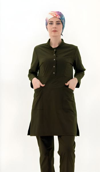 Ürünün tasarımı kapalı personellerin ihtiyaçları gözetilerek uzun kollu kurgulanmış olup, tunik boyu standart cerrahi takımlara kıyasla 15 cm daha uzun tutulmuştur. Üç adet çıtçıtla desteklenen bisiklet yakası kullanım kolaylığı sağlarken, S’den XL’a kadar olan geniş beden skalası her vücut tipine profesyonel bir uyum sunar.